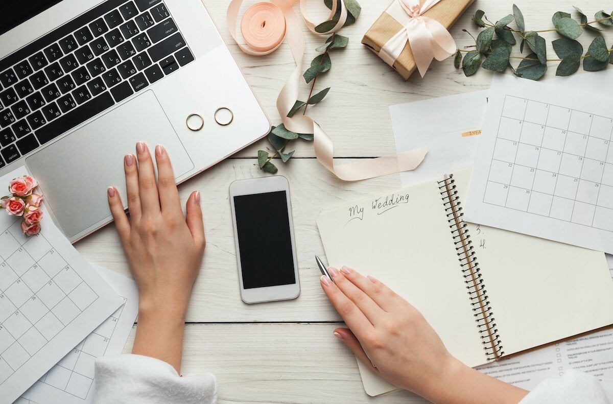 Bride in white dress reading a letter. Bouquet of flowers on the bed.
