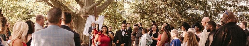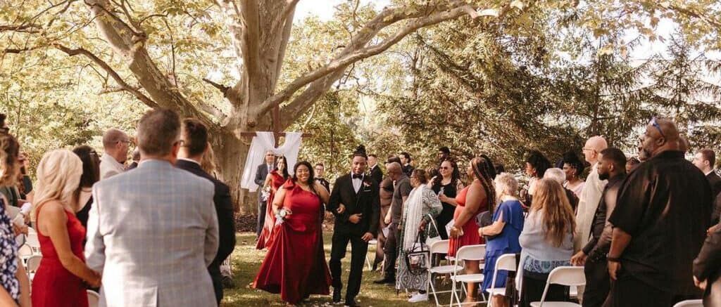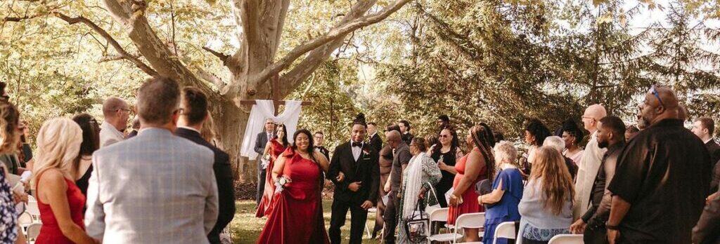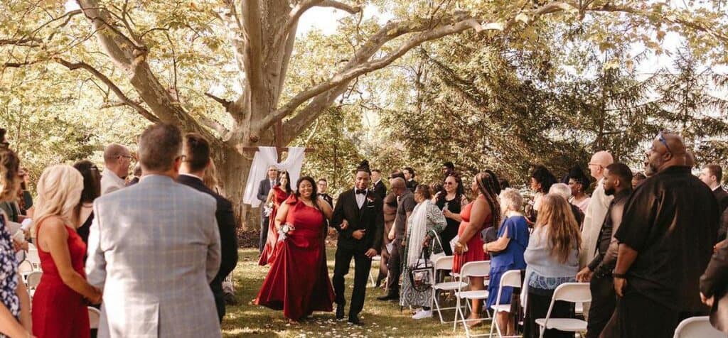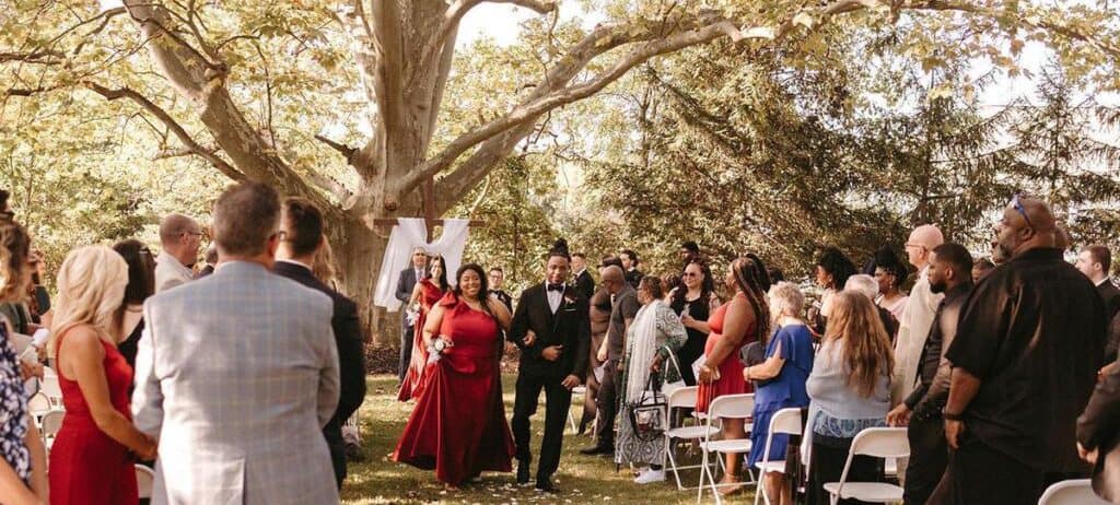 Cocktail attire is one of the most common requests for fall weddings in Rochester, NY. For women, this means a knee-length or midi dress in a chic, dressy fabric, such as velvet, satin, or chiffon. A-line silhouettes, wrap dresses, and slip-style gowns are all flattering options. Men should wear a suit and tie.