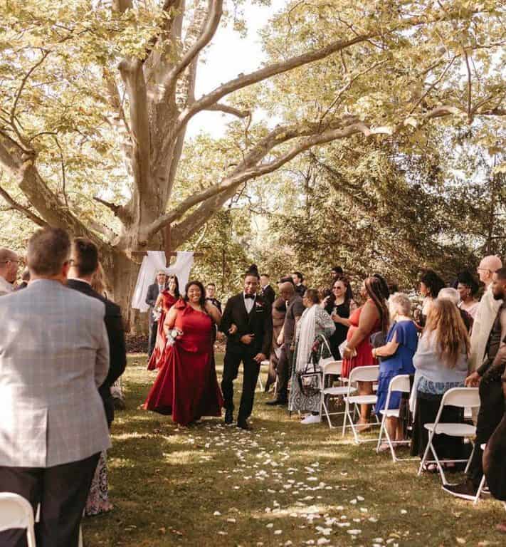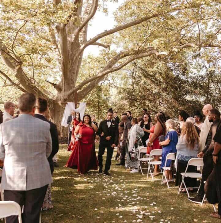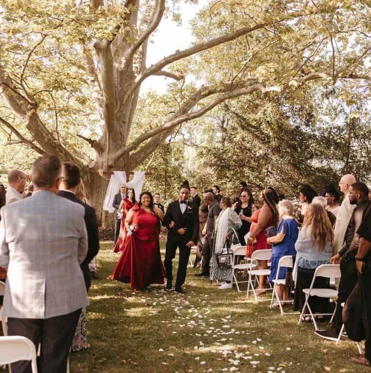 Colors like brown, amber, or forest green reflect the season beautifully. Add layers like a cozy wrap, leather jacket, or cardigan for outdoor ceremonies. If the venue is outdoors and celebration indoors-like at Oaks Manor-casual attire lets you lean into autumn textures like suede or corduroy without feeling overdressed. Shoes can be flats or short heels, men can wear casual dress shoes.